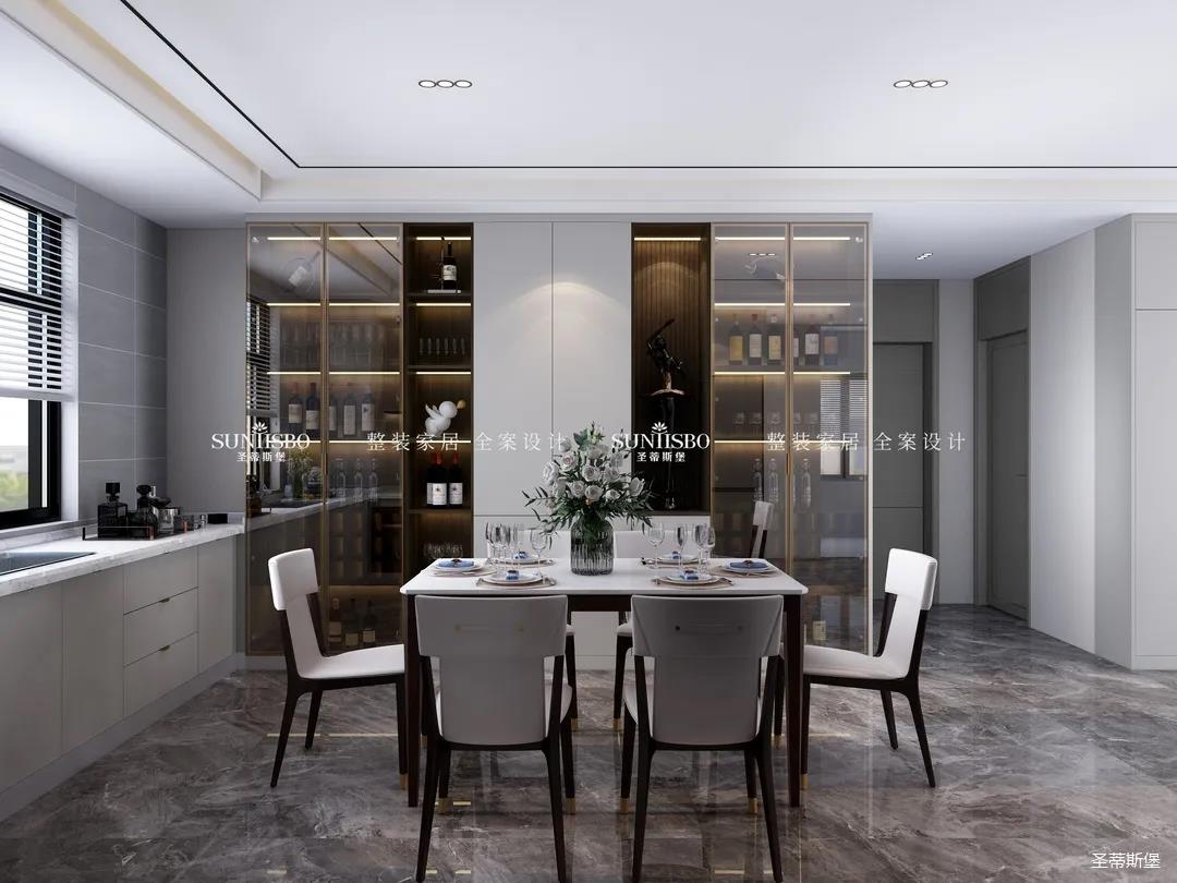 餐厅中大理石肌理的桌面自然袒露,自然亲肤的触感、皮革质感的现代餐椅坐感舒适自然。沉稳的实木材质延伸,精致的瓷白餐盘搭配金属质感的物件,通透的玻璃器皿点缀其中,契合了业主对品质生活的追求。